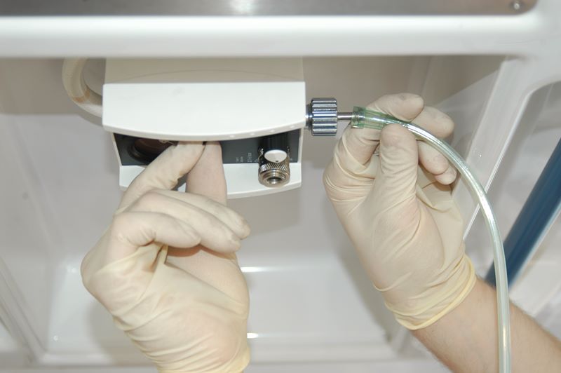 Beatmungsgeräte werden mittels eines Druckschlauches an die O₂-Versorgung angeschlossen. Zu beachten ist, dass es hierbei unterschiedliche Steckersysteme geben kann. Eine praktische Unterweisung und Übung an den verwendeten Systemen ist absolut notwendig!