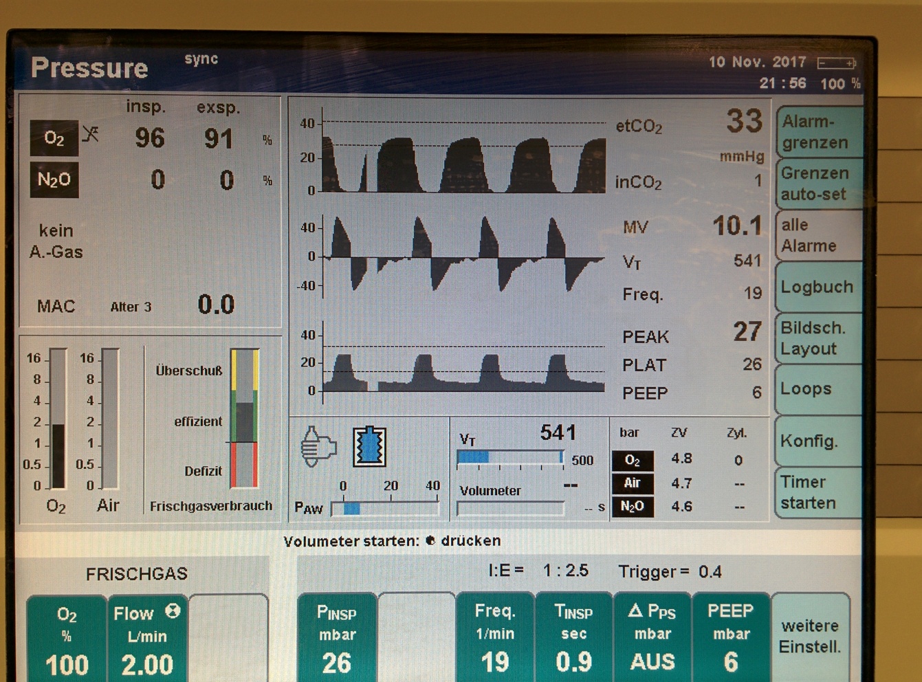 Druck-kontrollierte Beatmungsform. Achte auf die eingestellten und gemessenen Messwerte. Mittig finden sich die Druck- und Flusskurve sowie das Kapnogramm. Beachte dass das Kapnogramm zu den Druck- und Flusskurven zeitverzögert ist (CO₂-Konzentration während Inspiration), da die CO₂-Messung im Nebenstromverfahren erfolgt. [© GaSe ℓ MfG]