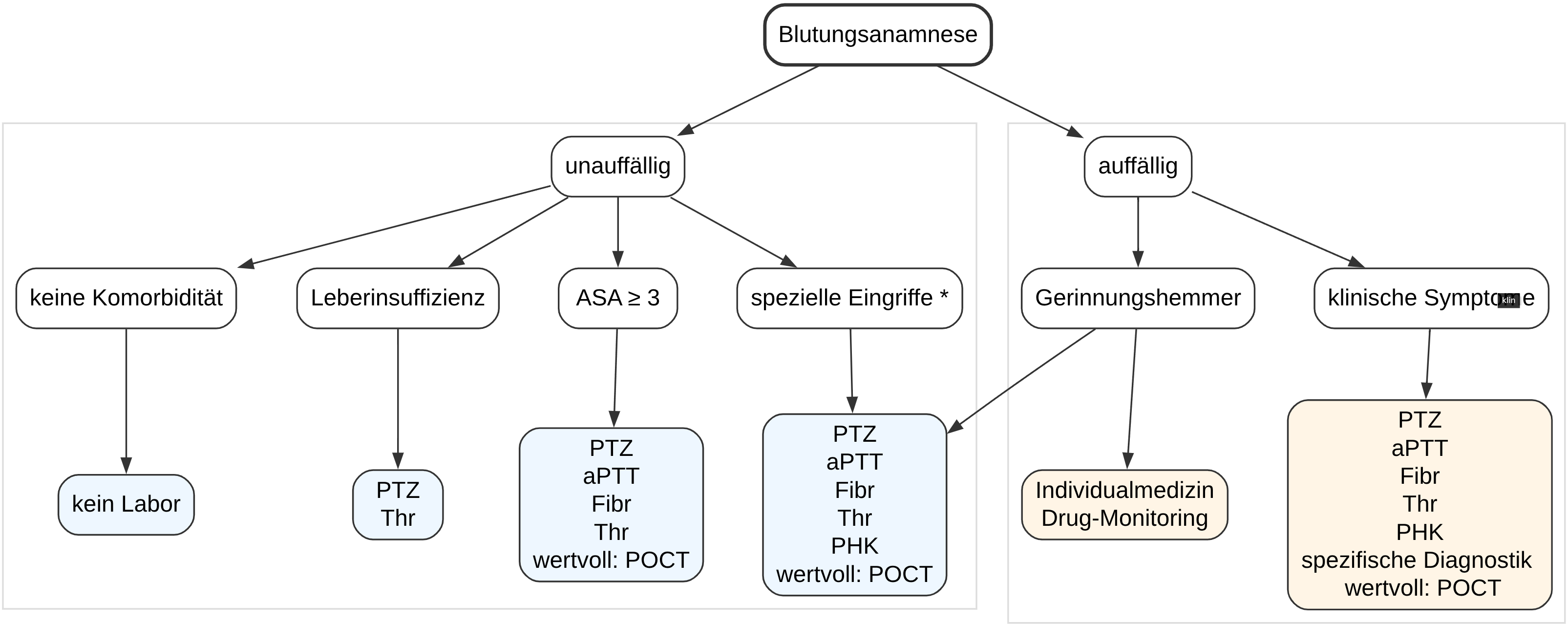 Entscheidend ist die klinische Blutungsanamnese (vgl. Tab. 16: Fragebogen zur Detektion einer Blutungsneigung (Erwachsene) nach ♛ ÖGARI Gerinnungsevaluierung 2024). Bei unklaren Situation sind spezielle Tests (z. B. von-Willebrand-Diagnostik, Plättchenfunktionsanalysen, Faktor XIII) erforderlich.